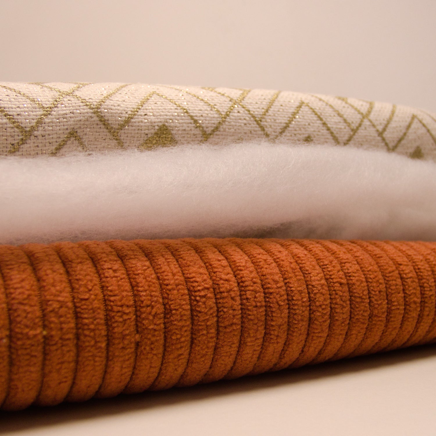 Du velours côtelé, un tissu d’ameublement déjà doublé avec une très haute résistance. Un rembourrage en ouate 100g/m² contre les chocs et les déformations. Des intérieurs 100% coton ou éponge de bambou plein de douceur. Du sherpa pour un maximum de style.